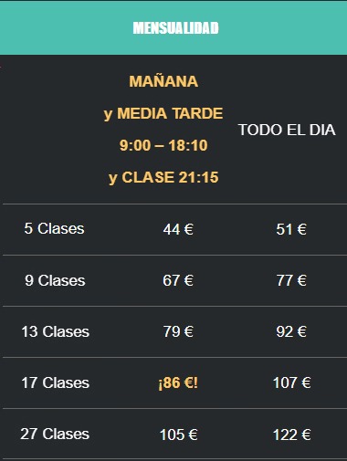 ![]() PROMOCIÓN 17 clases/mes 78€ De 10:00 a 13:30 Hasta el 31 de marzo de 2027 |